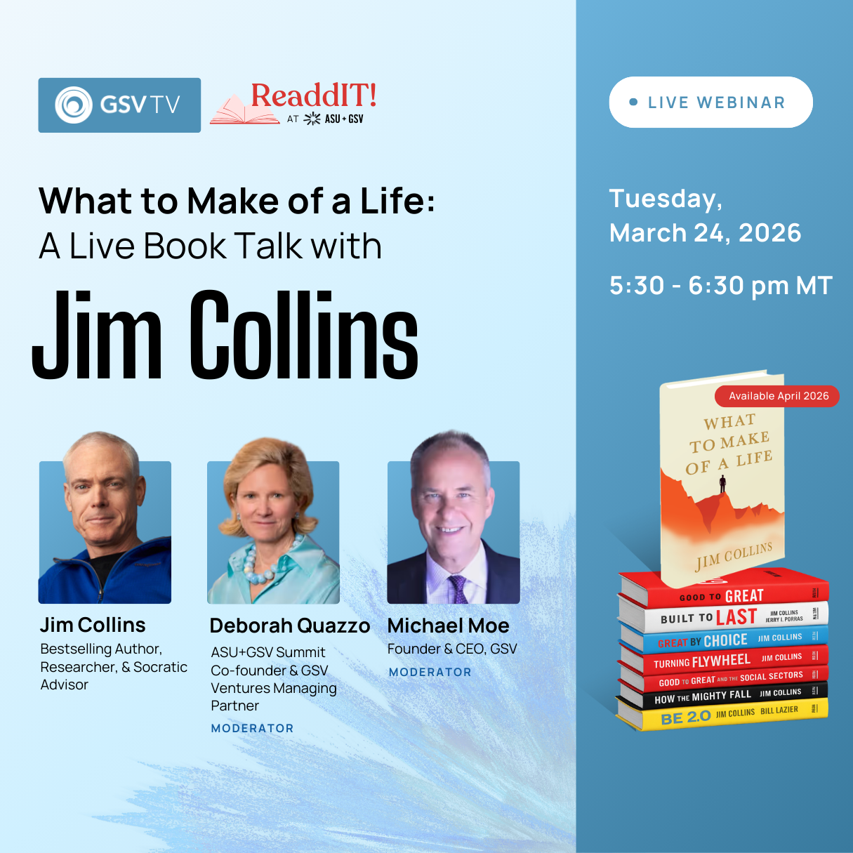 Author of Good to Great and Built to Last, Jim Collins has sold more than 10 million books worldwide and shaped the modern leadership lexicon with ideas like Level 5 Leadership, BHAGs, and the Flywheel. In this special ReaddIT! conversation, Collins joins GSV’s Michael Moe and Deborah Quazzo to reflect on What to Make of a Life—his first book since 2020 and the result of a ten-year research project exploring how individuals construct meaningful lives through pivotal moments.