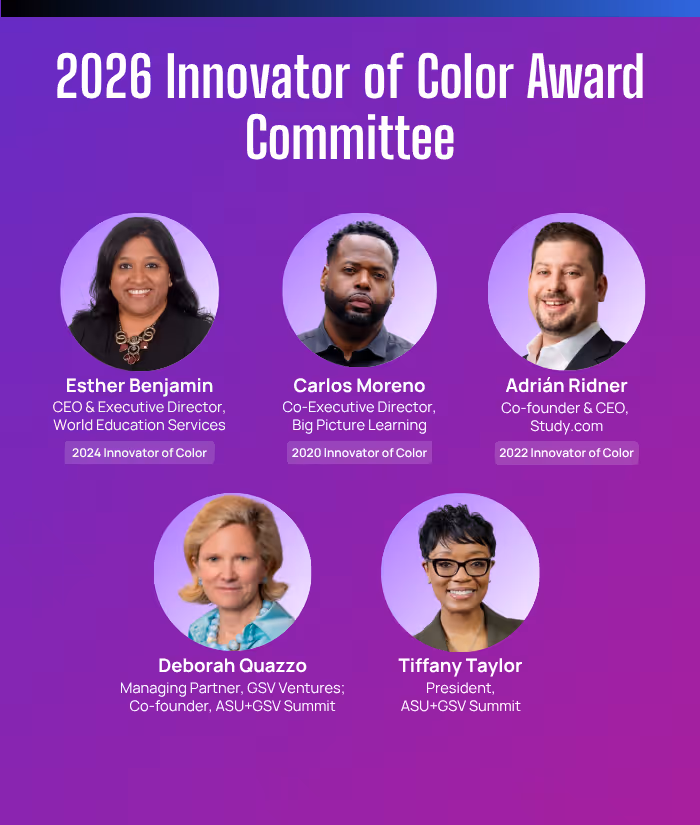 As we continue to elevate the impact and reach of Innovators of Color, the 2026 honorees will embody the spirit of fusion: the cosmic convergence of people, purpose, and pioneering ideas to expand access and opportunity for ALL. We look forward to your nominations and are honored to spotlight the trailblazers transforming digital learning and skills throughout the 2026 ASU+GSV Summit and beyond.