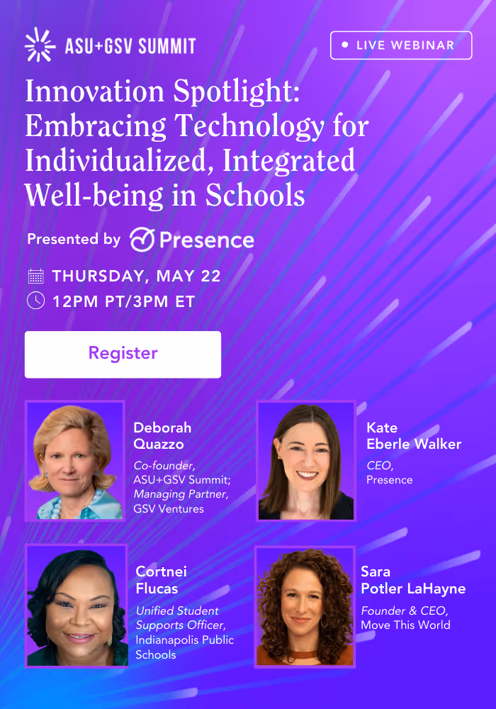 Join us for an Innovation Spotlight, presented by Presence, a virtual event exploring how technology is transforming student and educator support systems.