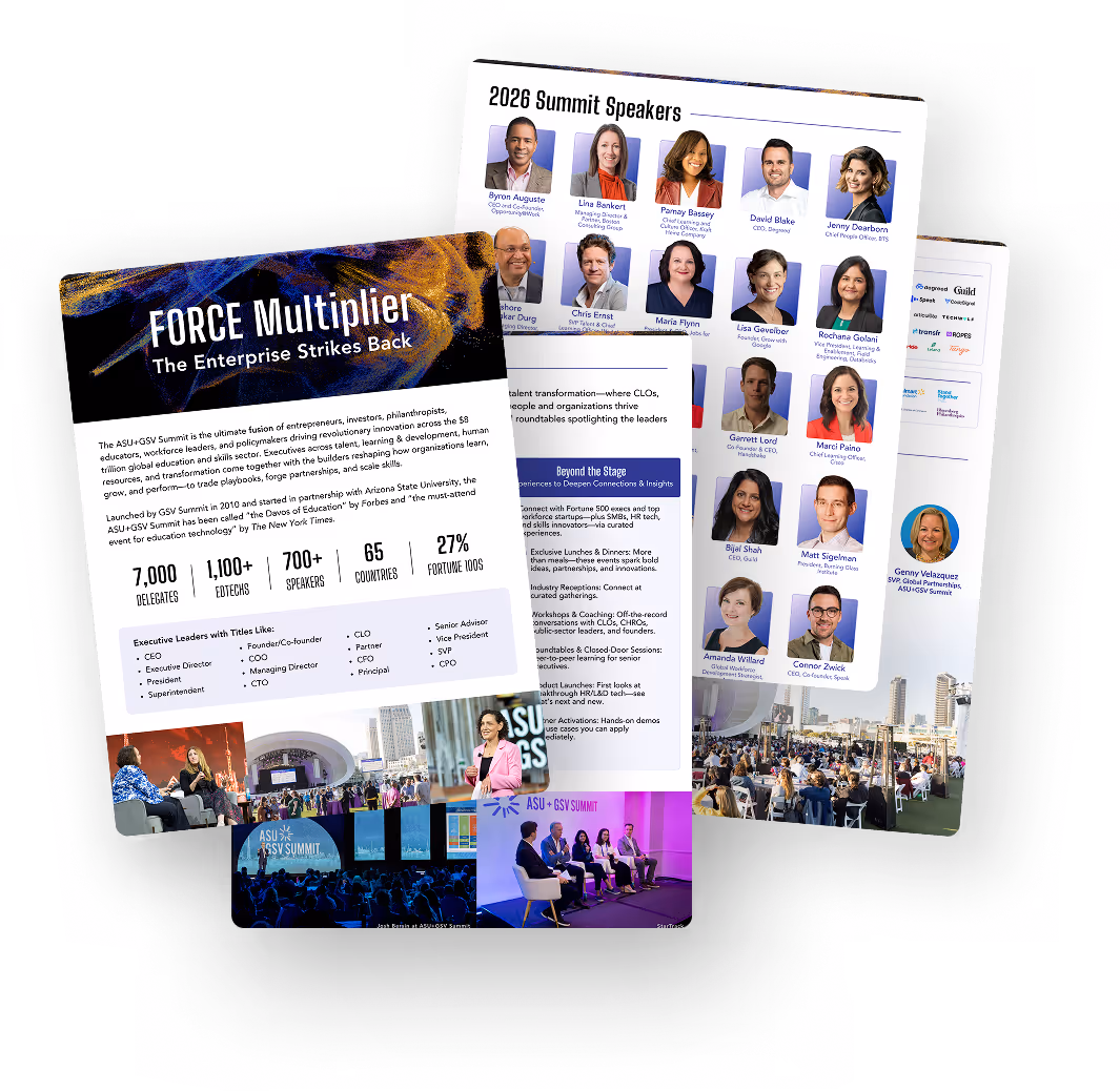 The ASU+GSV Summit is the premier global convening for leaders building high-performing, AI-enabled workforces, powered by the ultimate fusion of investors, entrepreneurs, educators, philanthropists, and industry professionals. Executives across Talent, L&D, HR, and Transformation meet the builders reshaping the $8T education & skills sector—from Fortune 500s to EdTechs and high-growth companies—to trade playbooks, forge partnerships, and scale skills. Launched by GSV Summit in 2010 and started in partnership with Arizona State University, the ASU+GSV Summit has been called “the Davos of Education” by Forbes and is the preeminent platform for connecting ideas, communities, and capital to unlock opportunity at scale.