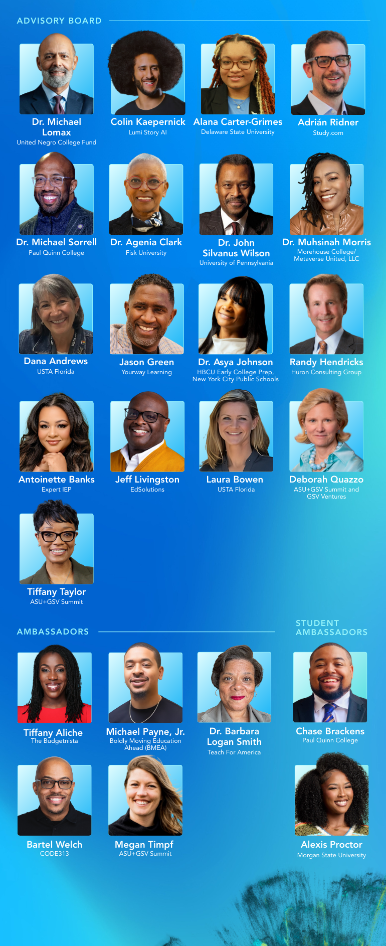 As we build on this foundation, we’re proud to announce the HBCU Partnership Advisory Board and Ambassadors: an assembly of dedicated partners in impact who will help steward and guide this long-term commitment to equity, access, and economic mobility.